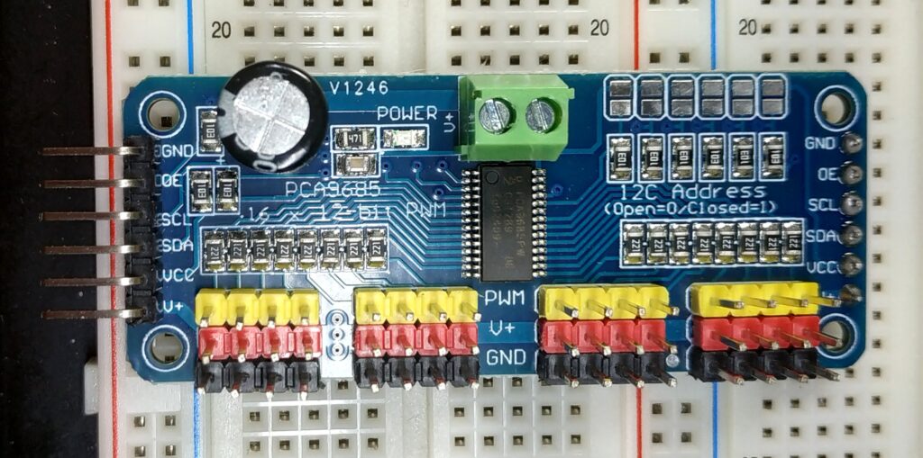보통 모듈의 왼쪽과 오른쪽에 똑같은 구성으로 6개씩 있는데, 이는 여러 개의 PCA9685를 기차놀이처럼 직렬(Daisy Chain)로 연결하기 쉽게 하기 위해서입니다.