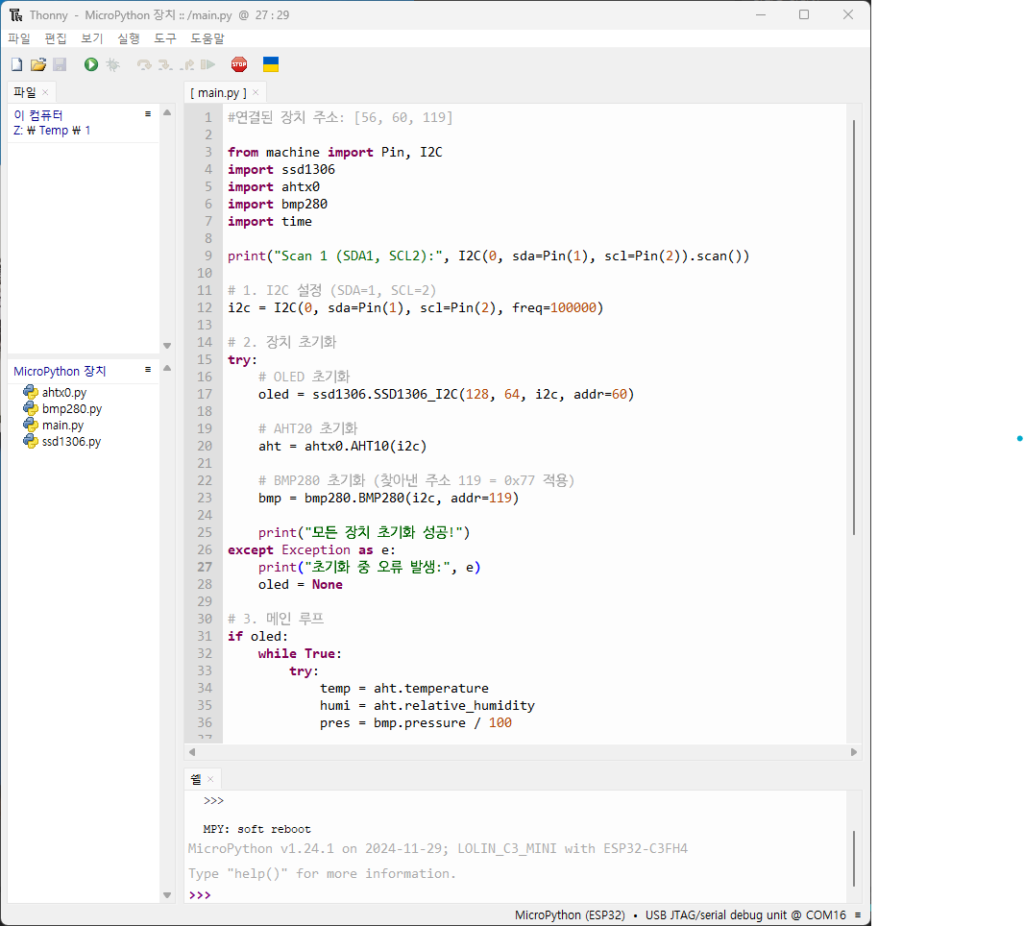 “온도, 습도에 기압까지 한 번에! 정밀 측정의 신세계 (AHT20 + BMP280)” 에 하나의 답글