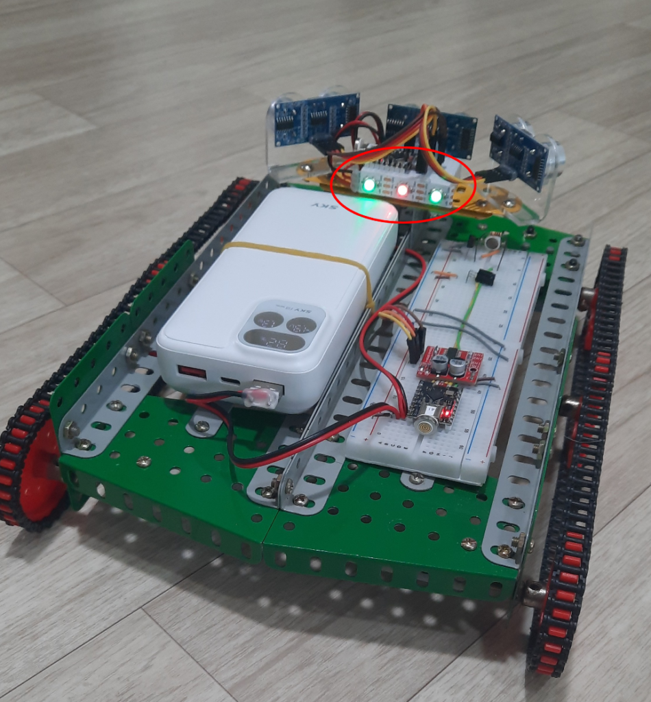실행 테스트를 하다가 발견한 문제점이 있습니다. 초음파 센서는 소리의 반사를 이용하기 때문에 장애물의 재질에 따라 측정값이 부정확할 수 있습니다.