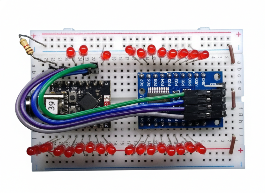 추가로 PCF8575 모듈 양쪽에 VCC와 GND가 있는 이유는 I2C 장치들을 직렬로 계속 연결하기 편하게 하기 위해서입니다. 이를 데이지 체인(Daisy Chain) 방식이라고 하는데, 덕분에 빵판이 훨씬 깔끔해집니다. 또한 INT 핀을 활용하면 CPU 부하를 획기적으로 줄일 수 있는 저전력 설계를 할 수 있습니다.