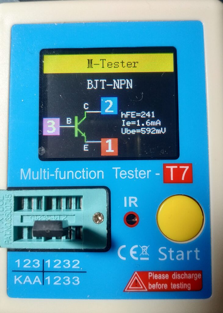 - hFE=241: S882의 증폭률 등급 중 ‘R’이나 ‘Q’ 등급에 해당하는 아주 좋은 수치입니다. (보통 60~400 사이)
